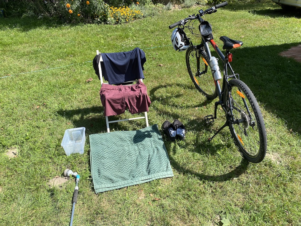 Chciałem jeszcze sprawdzić, ile czasu zajmie mi przebranie się po pływaniu do stroju rowerowo-biegowego. Stwierdziłem, że w prosty sposób mogę sobie to zasymulować. Na zdjęciu widać moją “strefę zmian”. Byłem przebrany w kąpielówki, czepek i okularki. Zmoczyłem się wężem ogrodowym, zrobiłem kilka kółek biegiem po podwórku i przebrałem się w strój do biegania ;) W ten prosty sposób przetestowałem ostatni element układanki w całkowicie domowych warunkach.