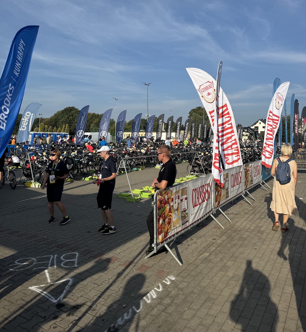 Również dzień wcześniej można zostawić rower w strefie zmian na swoim miejscu. Jest to bardzo dobra opcja, ponieważ oszczędzamy w ten sposób czas rano i nie trzeba niepotrzebnie stresować się kolejną rzeczą do załatwienia przed startem (a w moim przypadku start był bardzo wcześnie o 8:45). Na miejscu jest cały czas ochrona, więc nie ma obaw przed ewentualna kradzieżą. Oprócz stojaka na rower w strefie zmian każdy ma do dyspozycji “kuwetę”, gdzie składamy resztę swojego sprzętu jak np. strój do biegania, buty, kask, ręcznik, wodę, żele energetyczne itd.