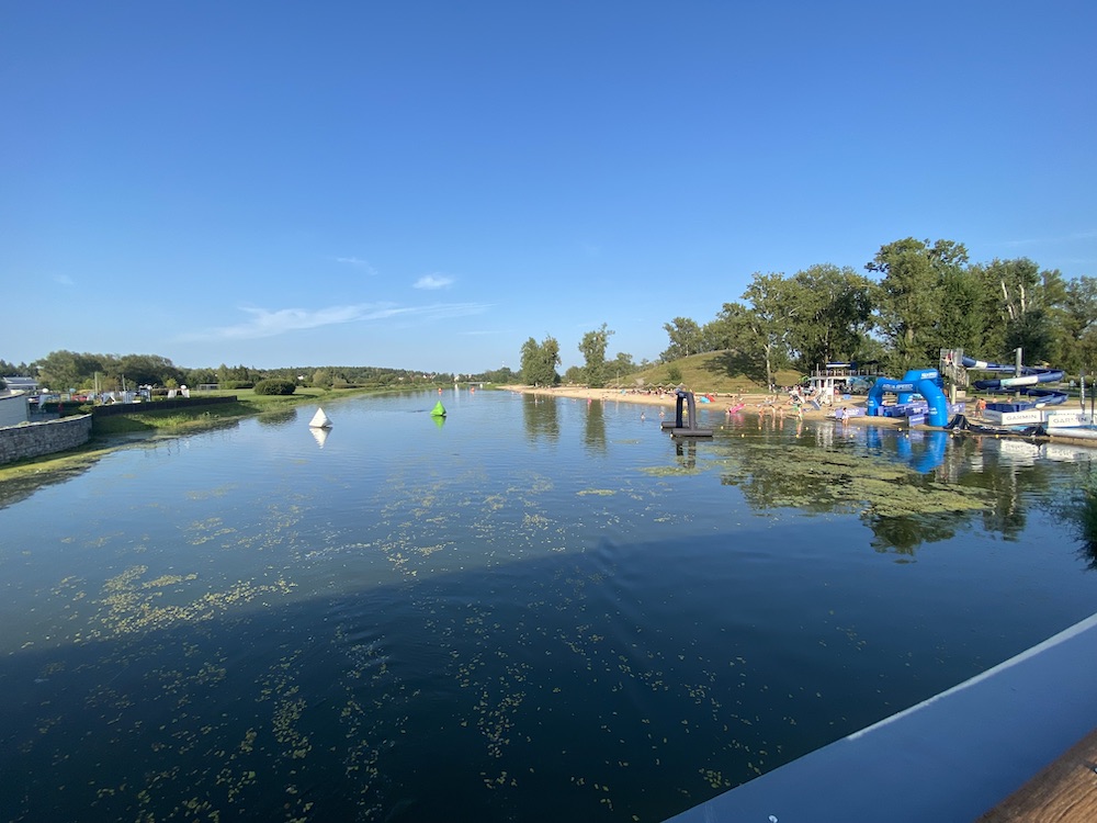 Dzień przed zawodami można było odebrać pakiet startowy, którego najważniejsze elementy to numer startowy na koszulkę, kask i rower, czepek na etap pływacki i czujnik do pomiaru czasu. Jeśli mamy taką możliwość, to uważam, że warto dzień wcześniej podjechać na miejsce i zrobić rozpoznanie terenu. W tym momencie powinno już być wszystko ustawione, czyli meta, strefa zmian, dobieg z pływania, trasa biegowa, trasa rowerowa, itd. Na spokojnie można wszystko obejrzeć. Dzięki temu następnego dnia jesteśmy już zorientowani w terenie i trudniej o pomyłkę. Jedną z moich głównych obaw przed startem było niepotrzebne “zamotanie się” np. poprzez szukanie swojego roweru, czy pobiegnięcie w niewłaściwe miejsce. Na szczęście na tej imprezie wszystko było bardzo czytelnie i wyraźnie oznaczone.